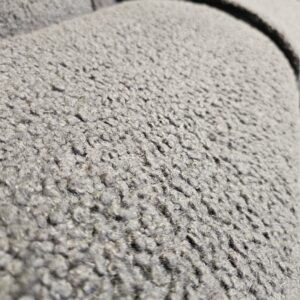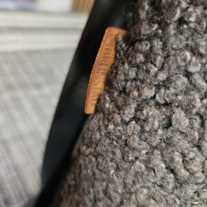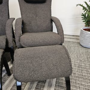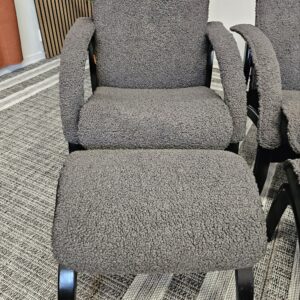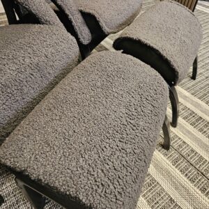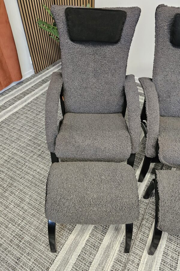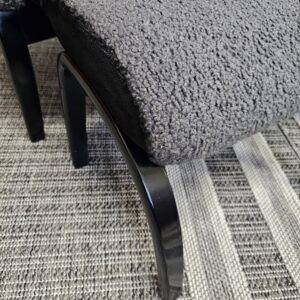 Stolene er trukket i mykt og eksklusivt grått fåreskinn, kombinert med elegant treverk i svart beis.