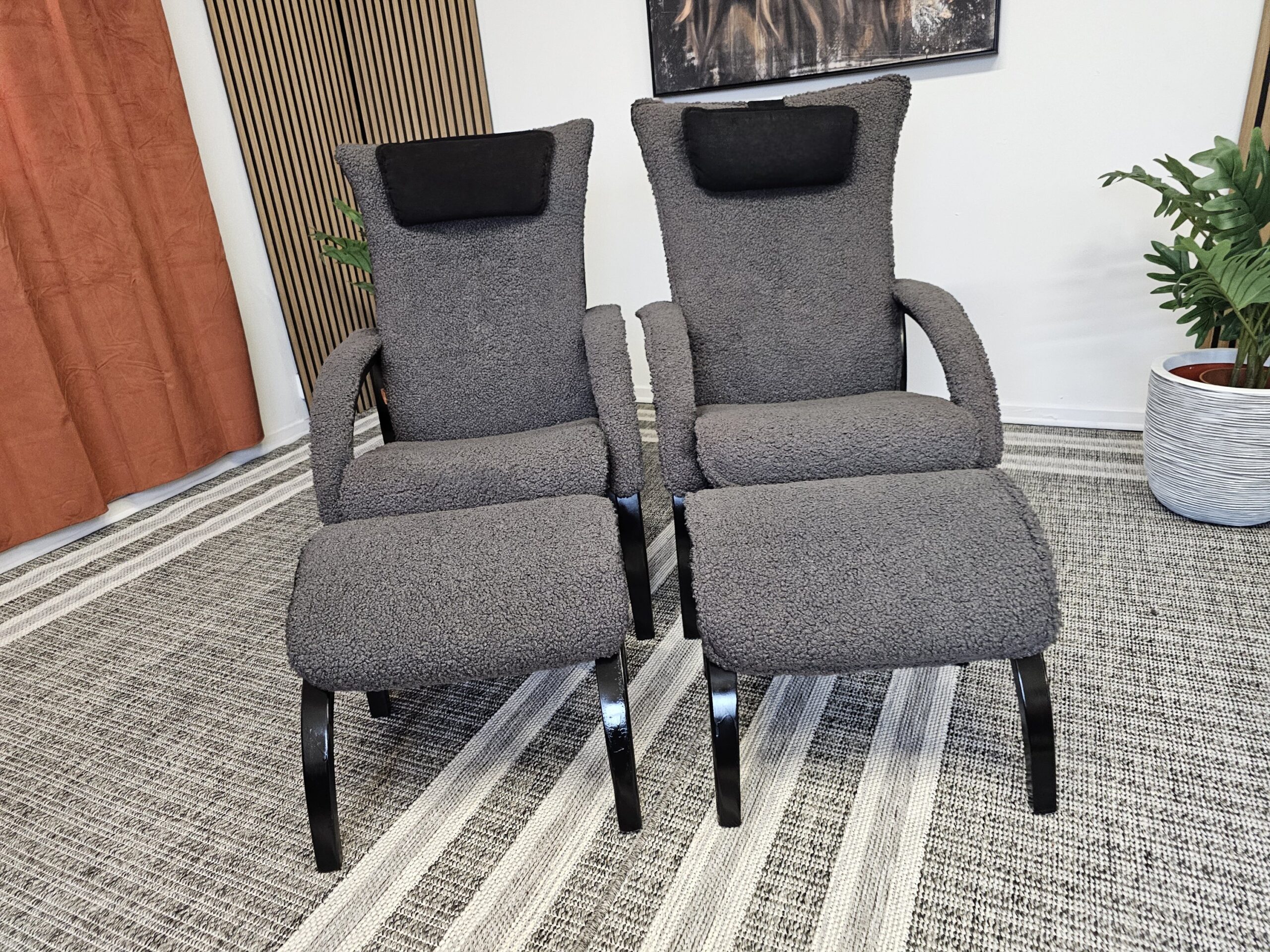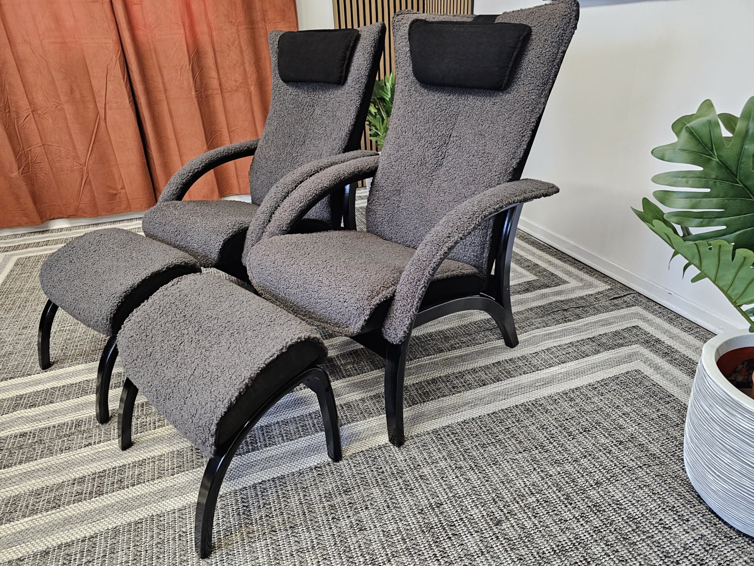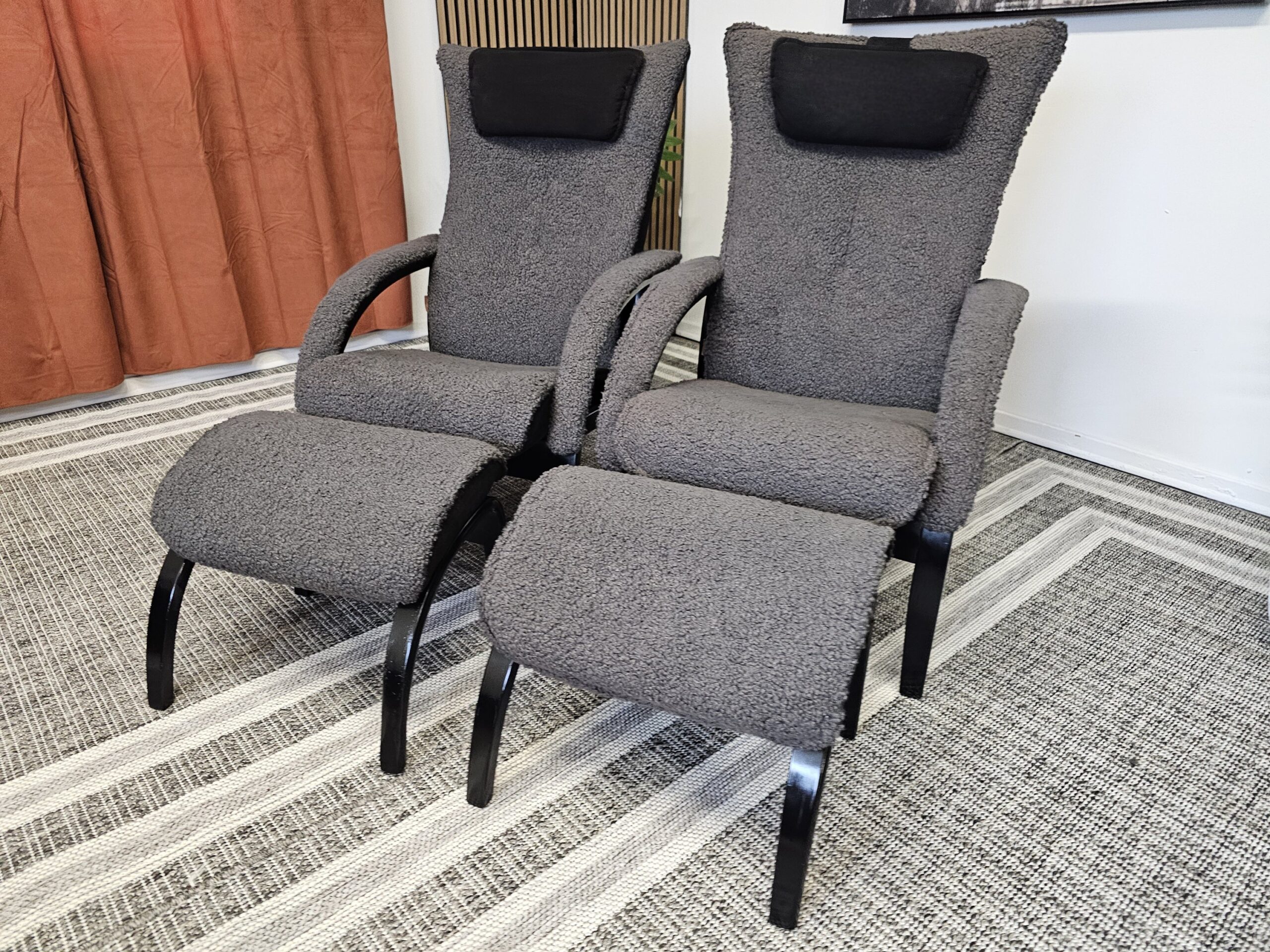 2 stk. Brunstad Delta Legend lenestoler m/krakk – Grå fåreskinn, svartbeiset treverk
