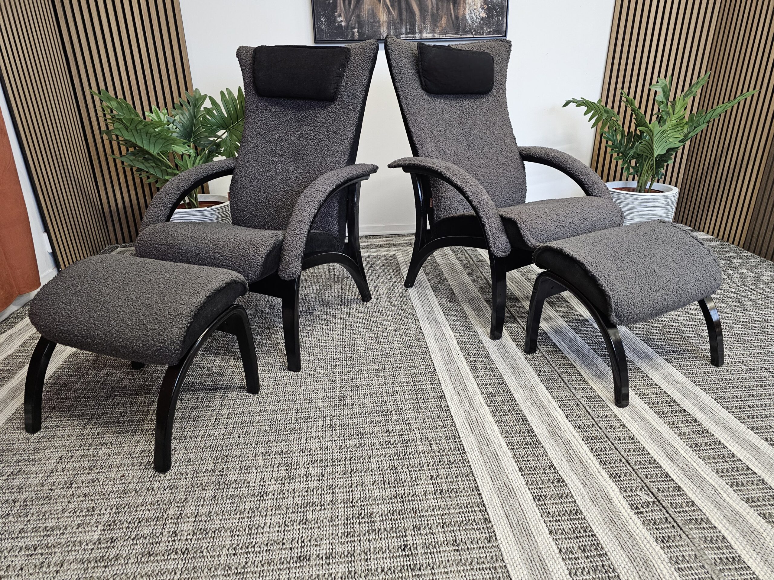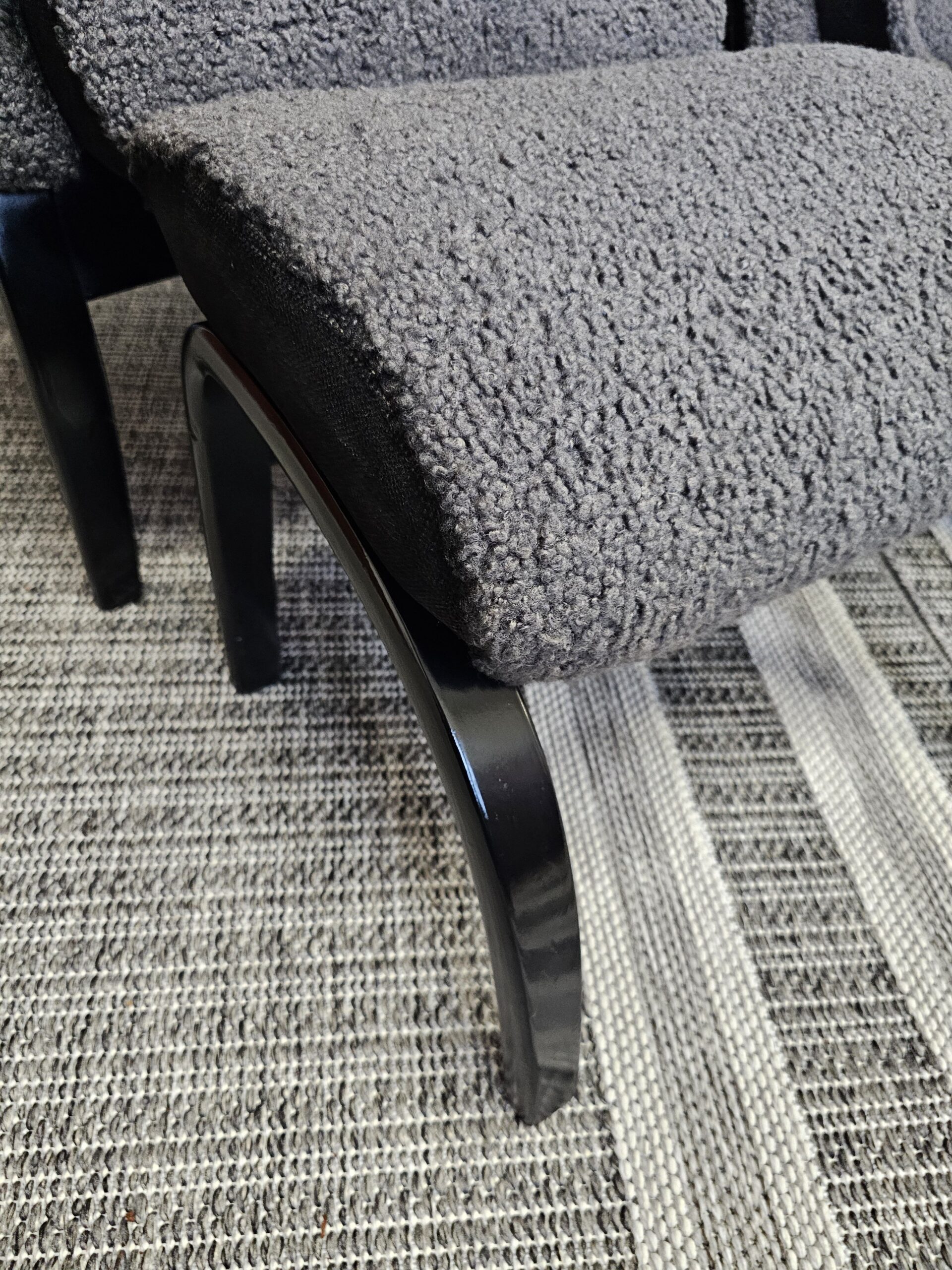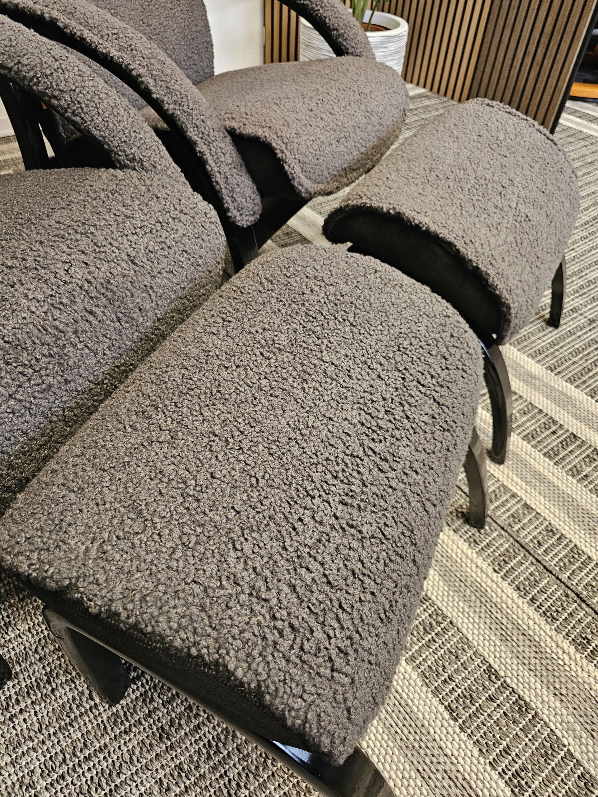 Stolene er trukket i mykt og eksklusivt grått fåreskinn, kombinert med elegant treverk i svart beis.