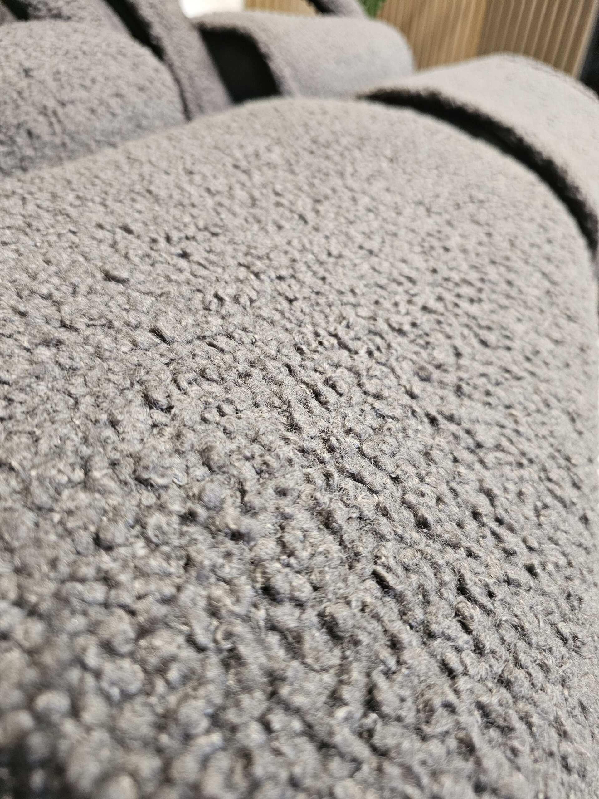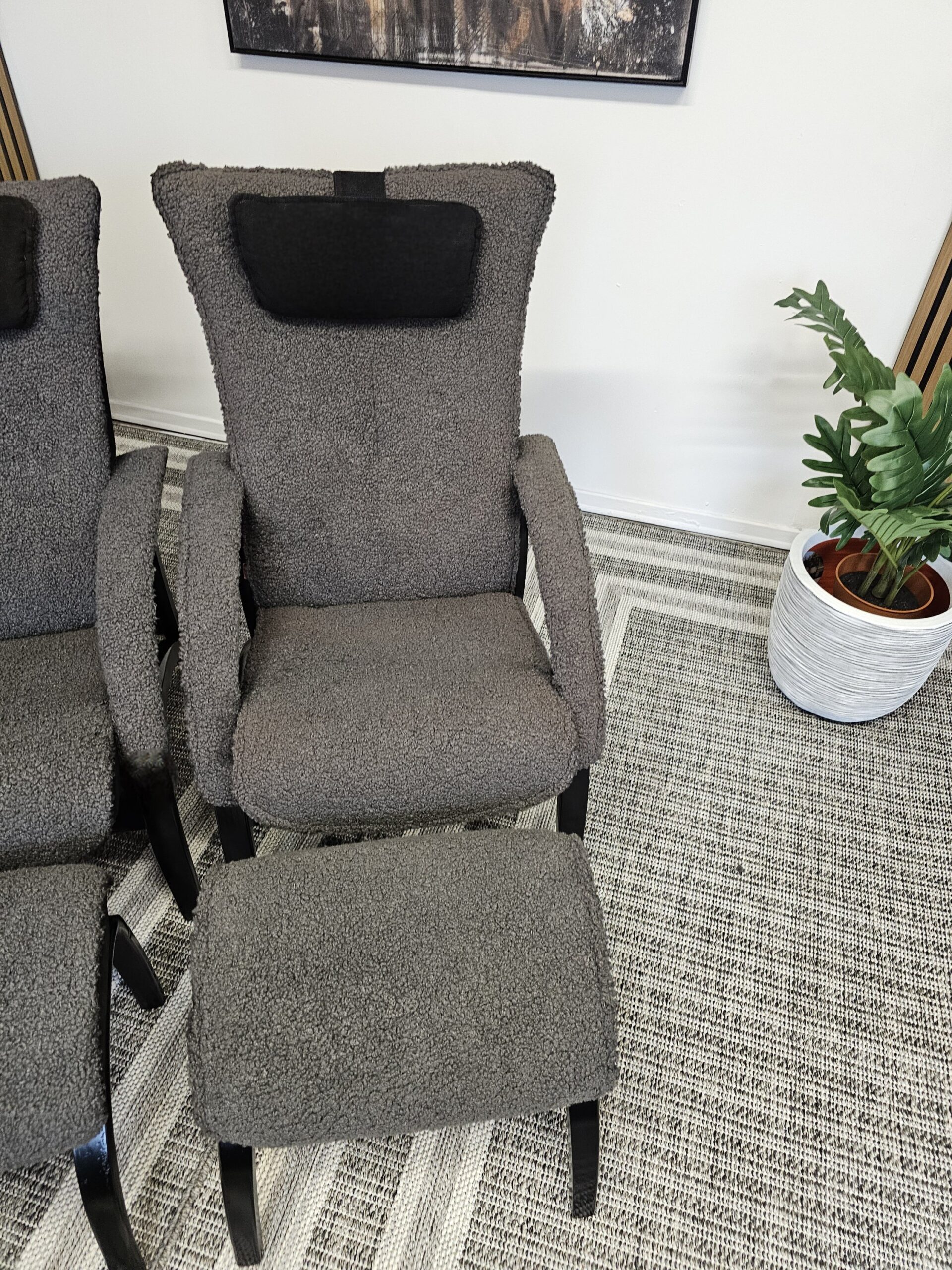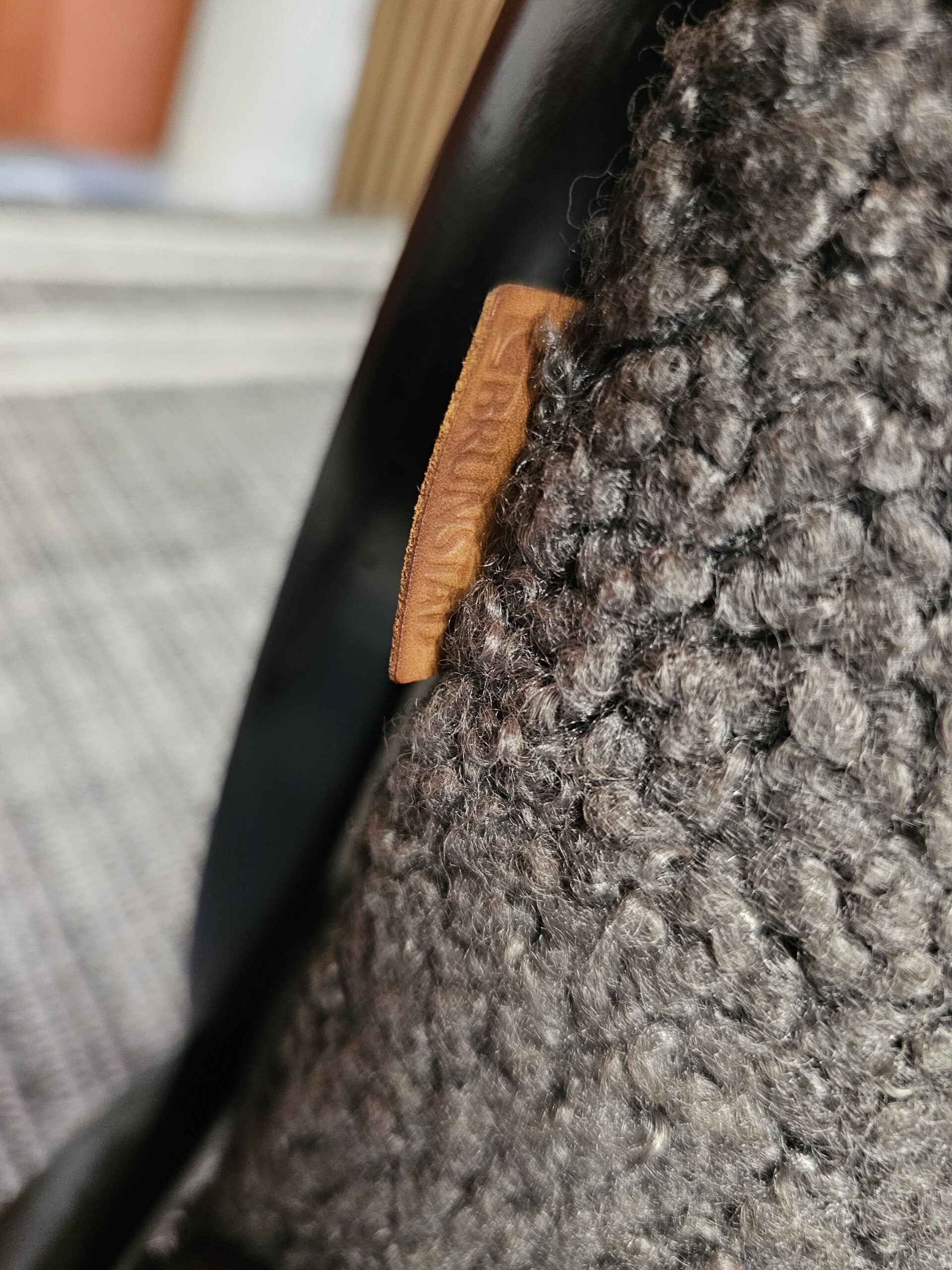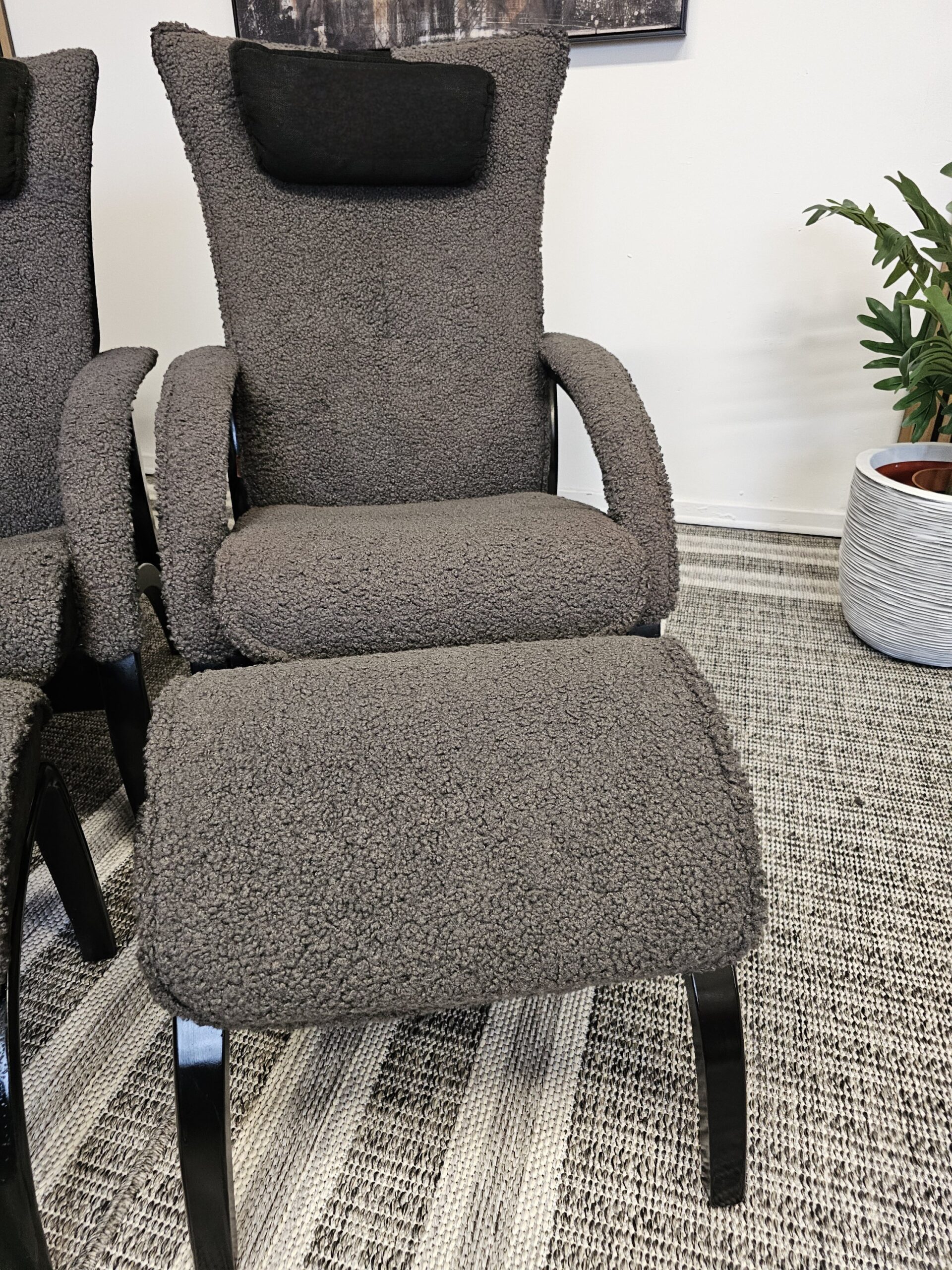 Stolene er trukket i mykt og eksklusivt grått fåreskinn, kombinert med elegant treverk i svart beis.