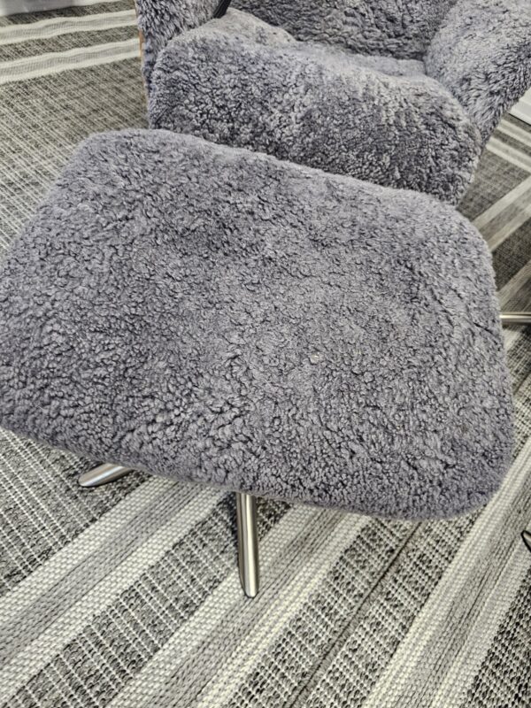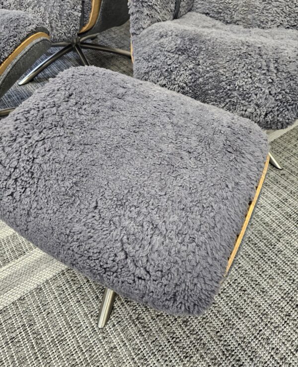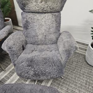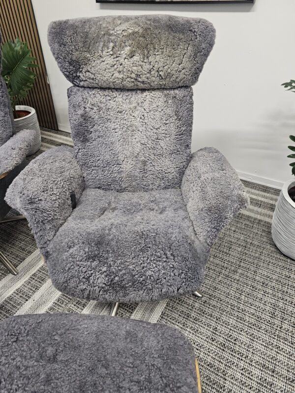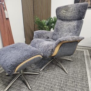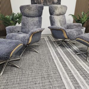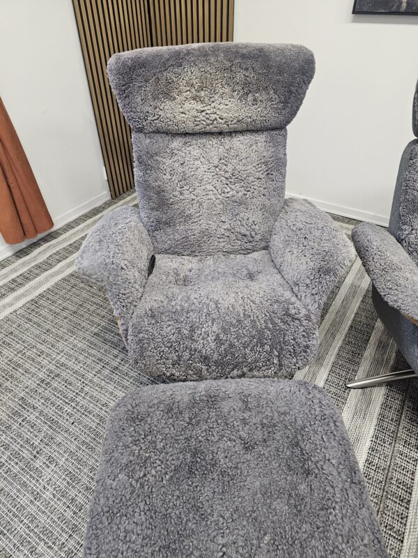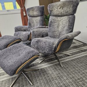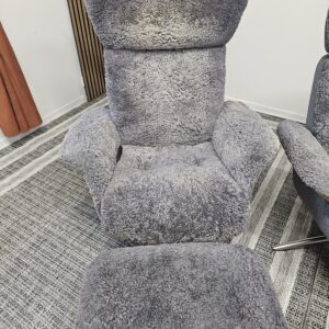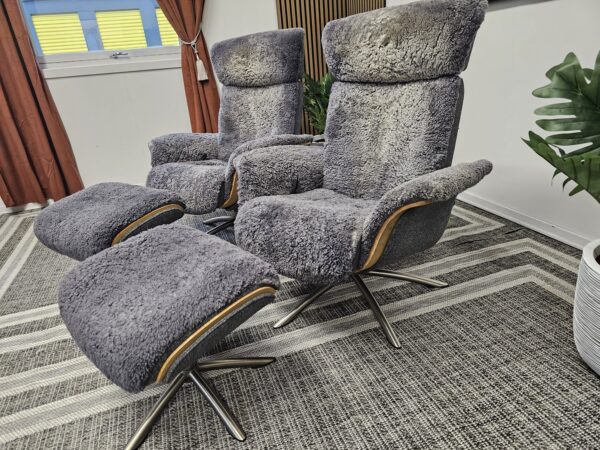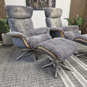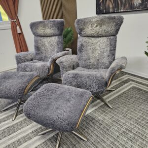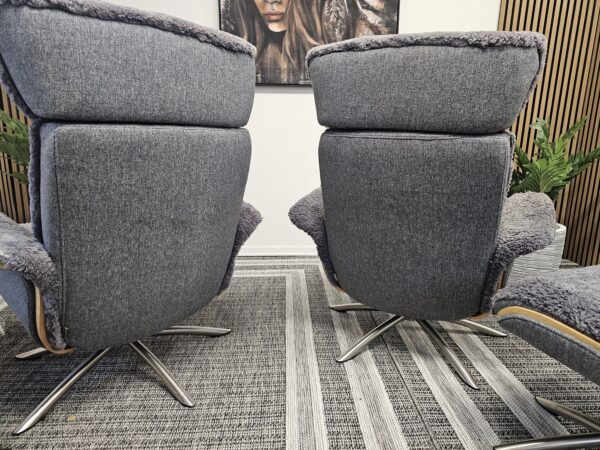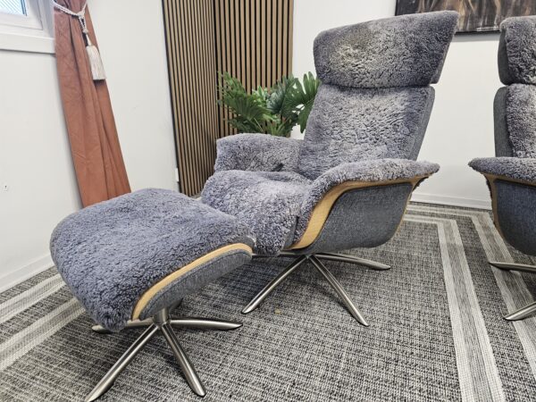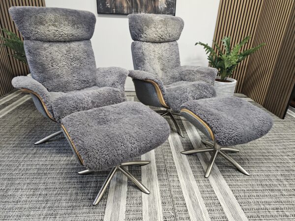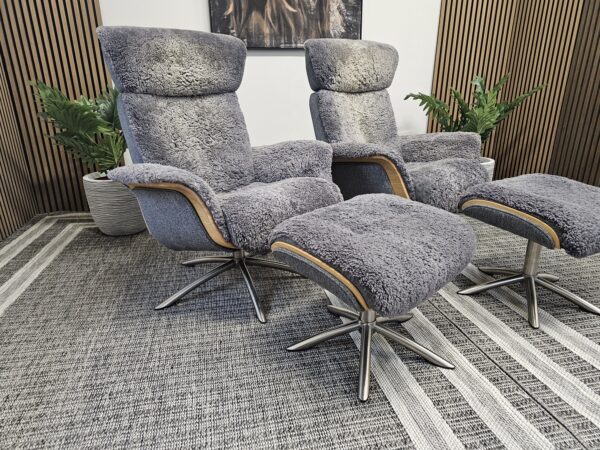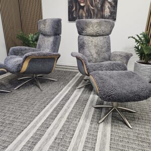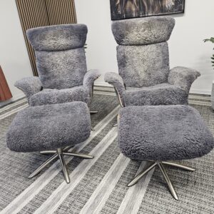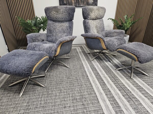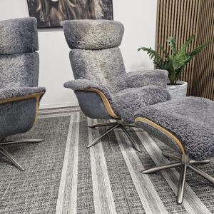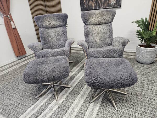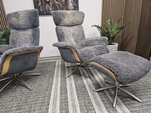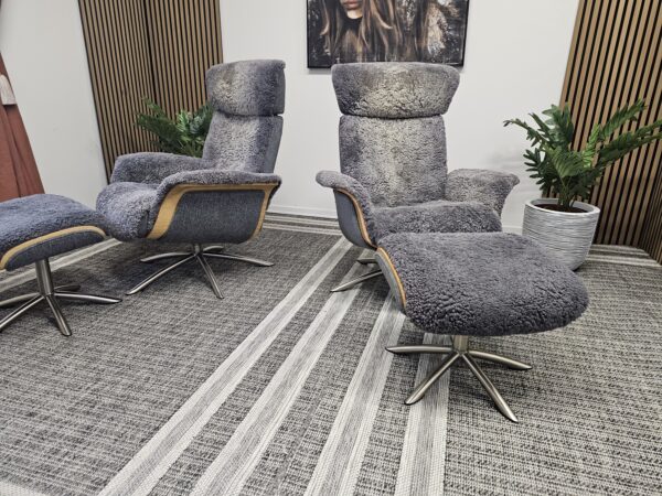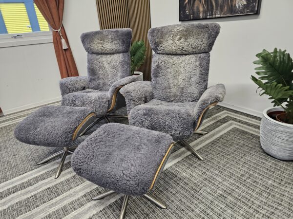 Møblerking presenterer: 2 stk. IMG Galaxy hvilestoler m/krakk – Grått fåreskinn & ullstoff