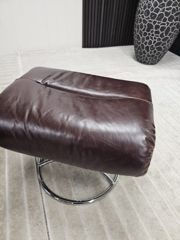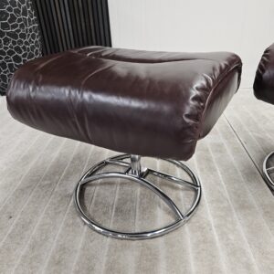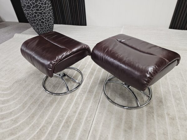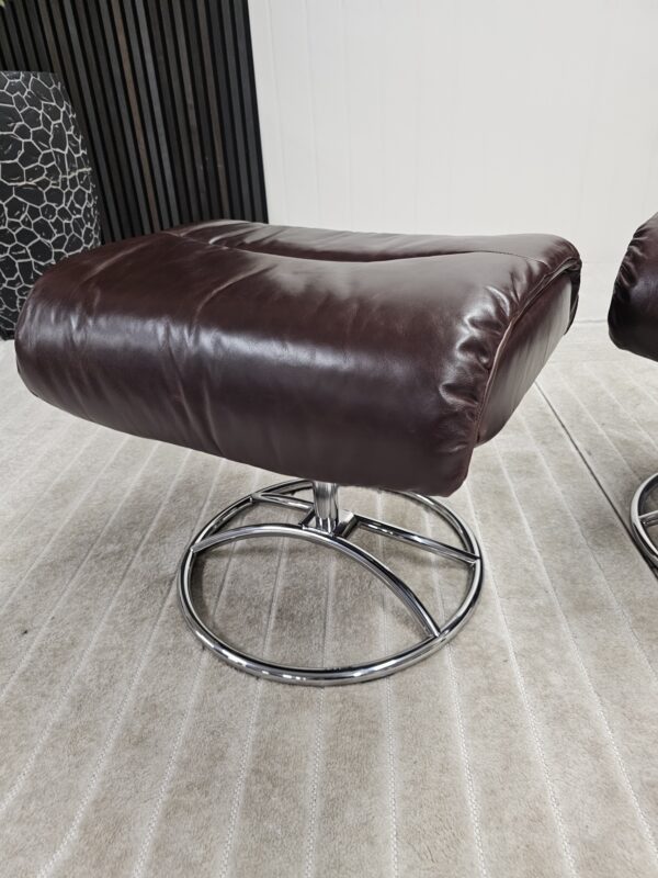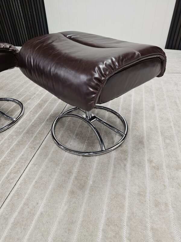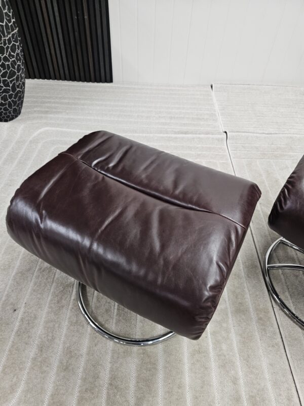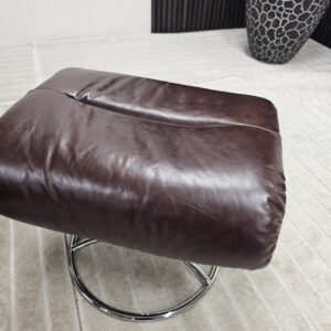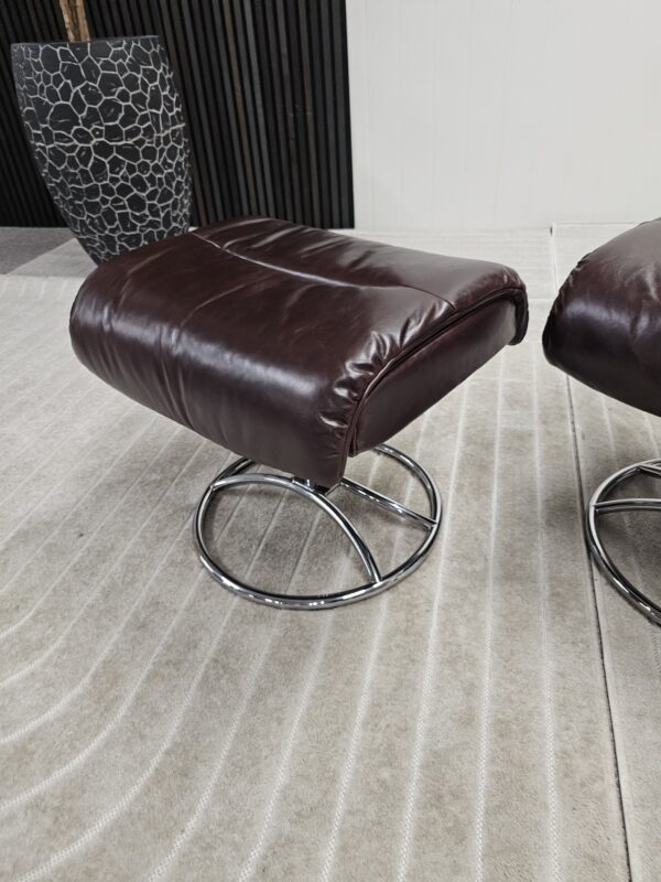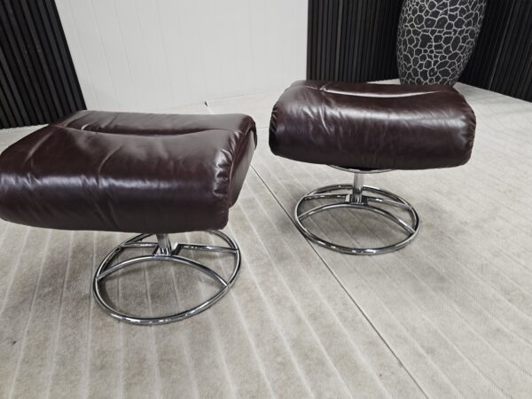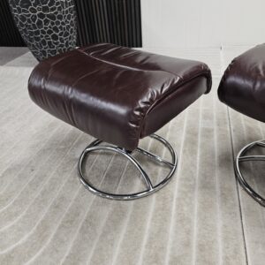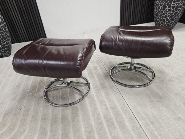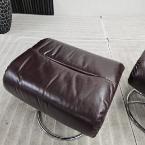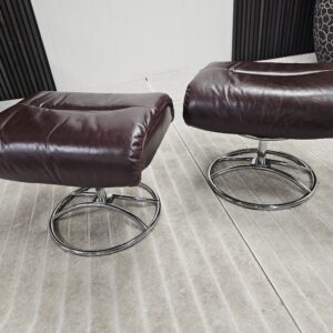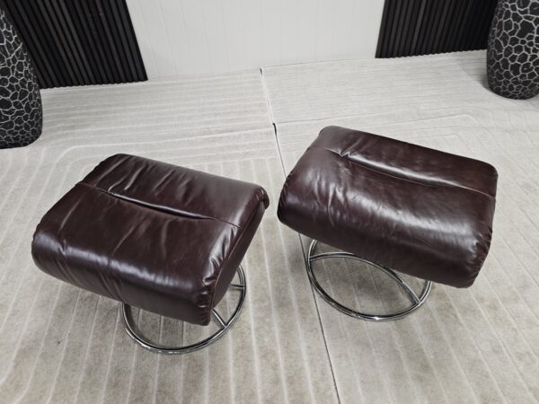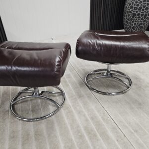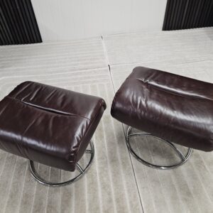 Selger 2 stk. helt nye Stressless fotskamler i Paloma Chocolate skinn med elegant understell i krom.