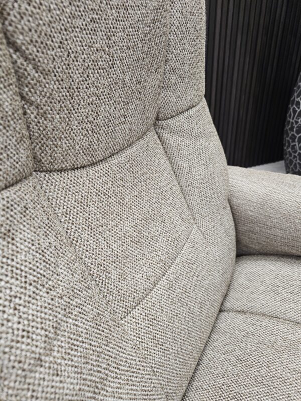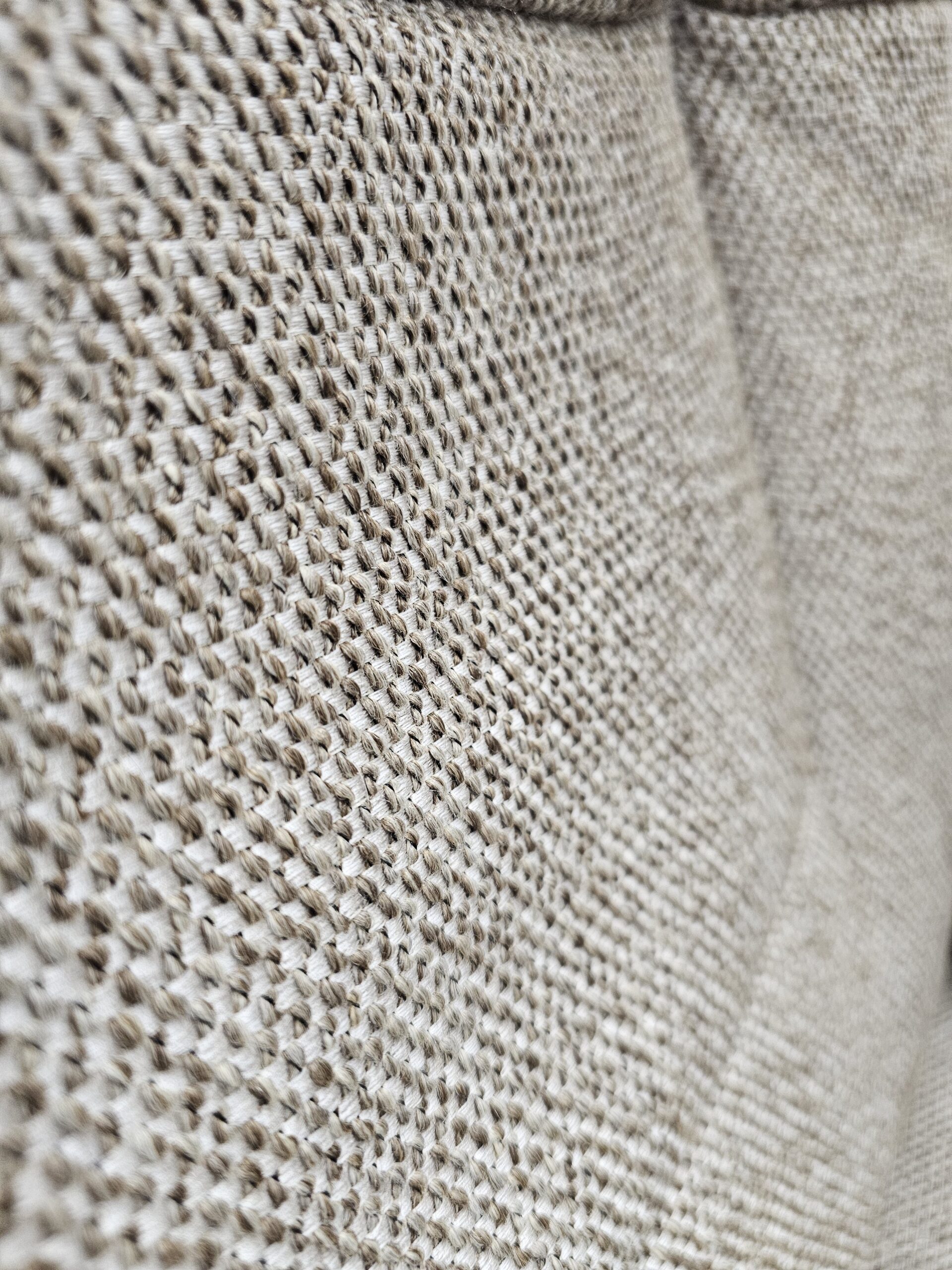 Trukket i eksklusivt Clover stoff med solid understell brun beiset treverk – en tidløs kombinasjon av komfort og design.