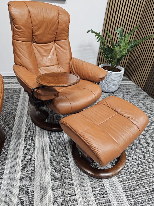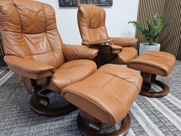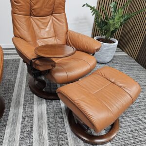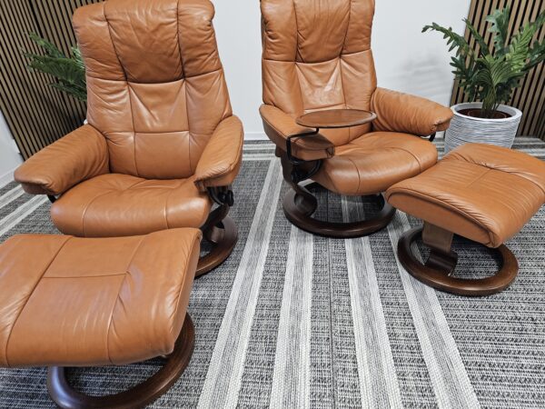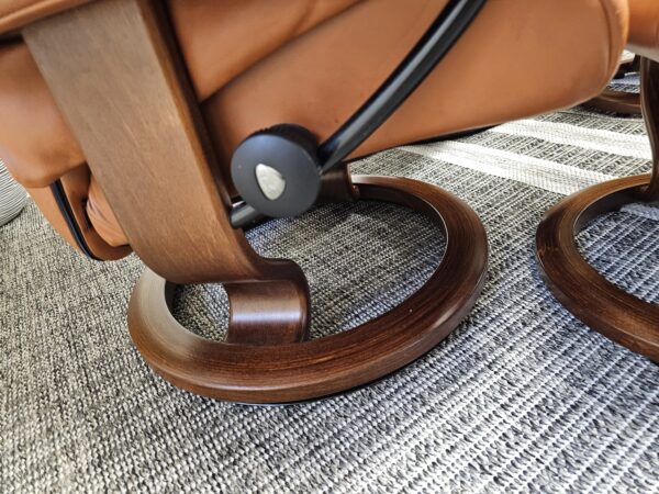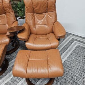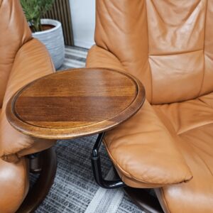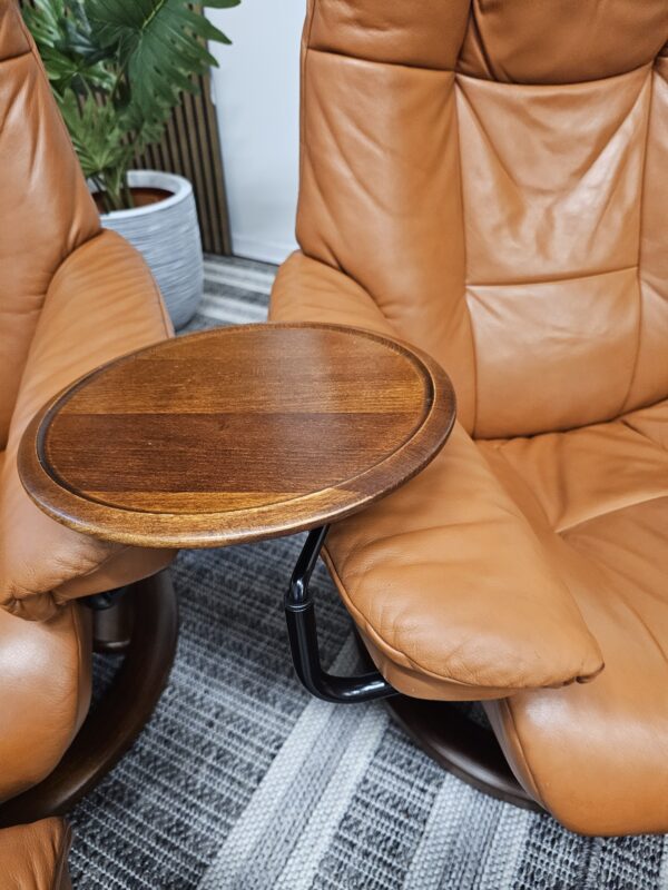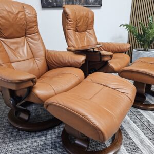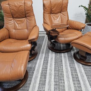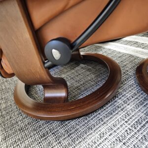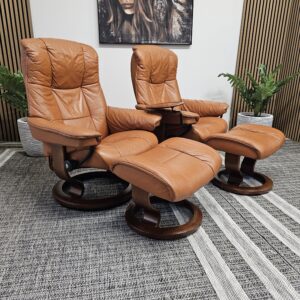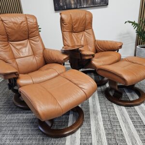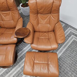 Begge er trukket i klassisk Cognac skinn med elegant brunbeiset treunderstell. En av stolene leveres med originalt Stressless Swing-bord, et praktisk og eksklusivt tilvalg.