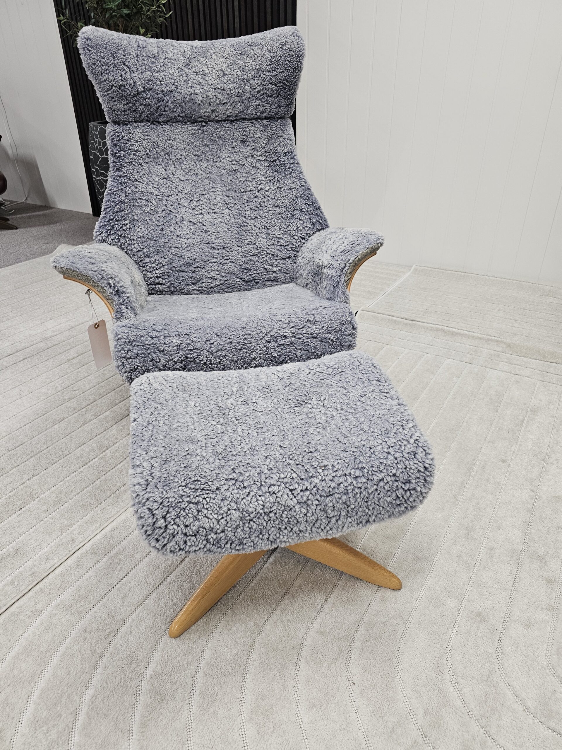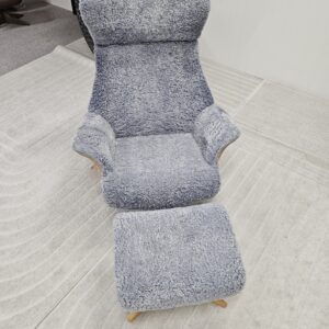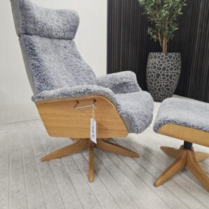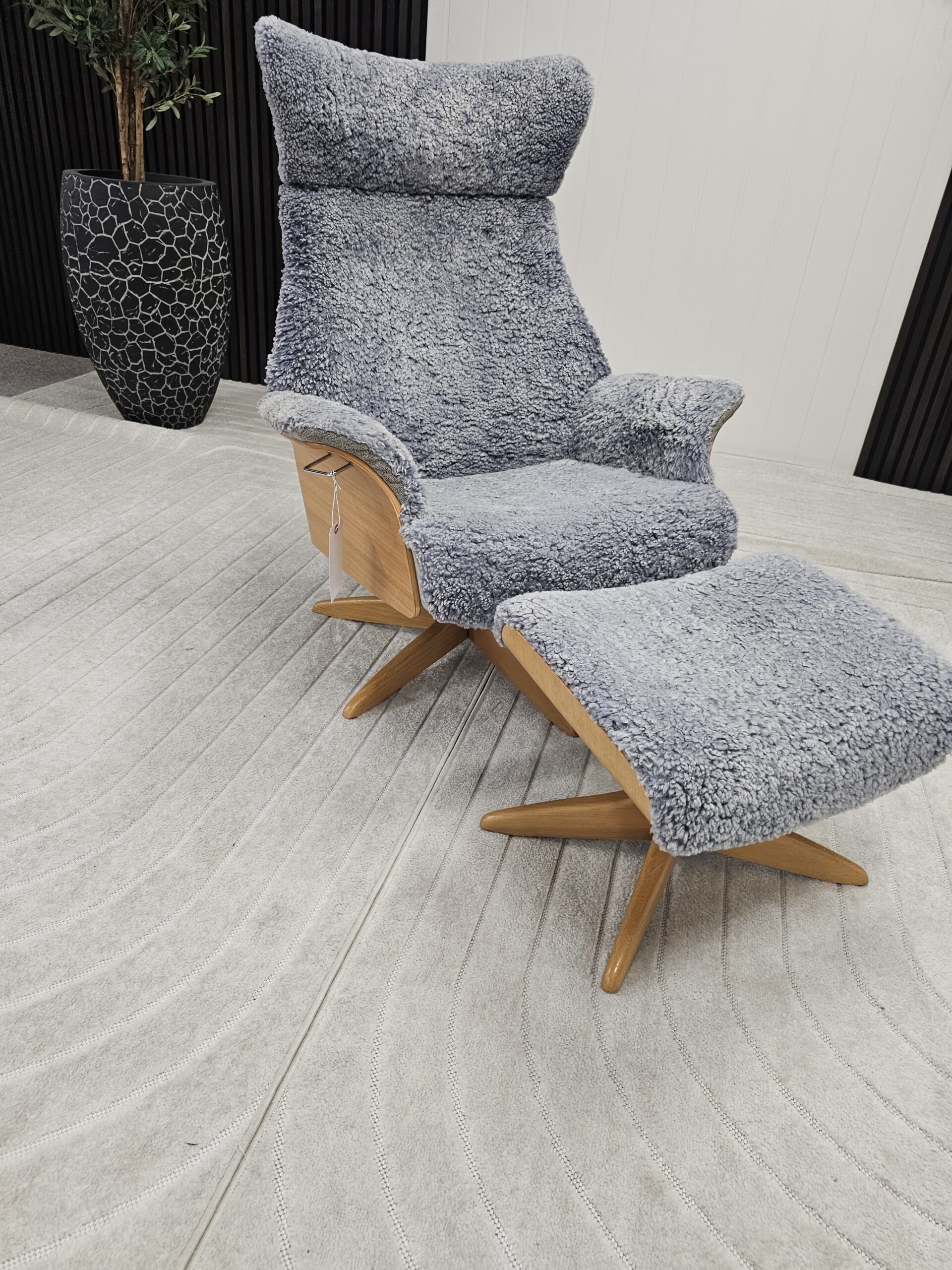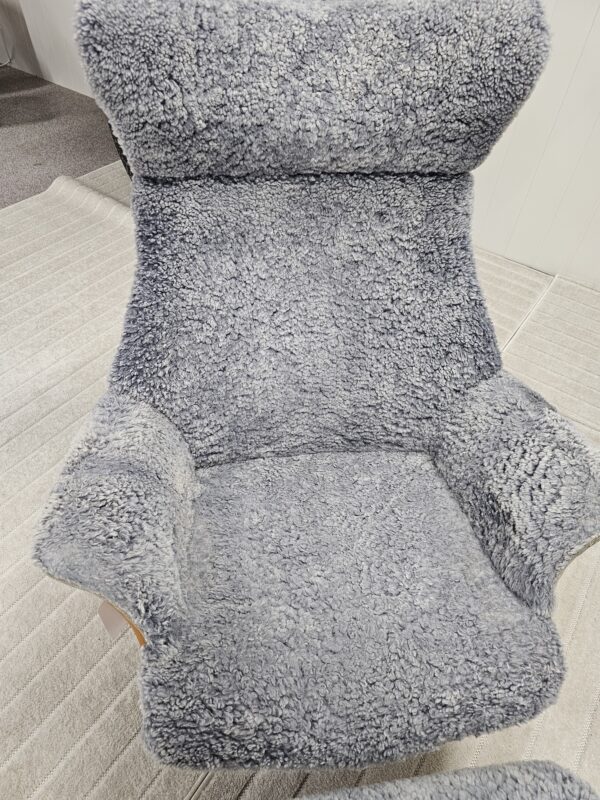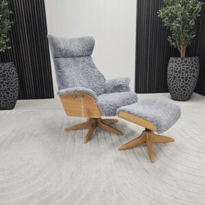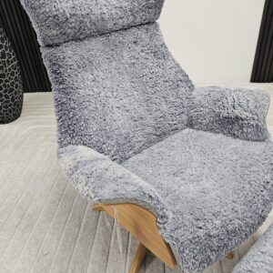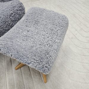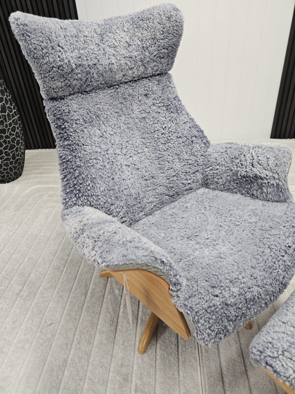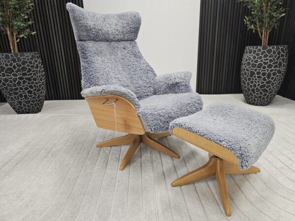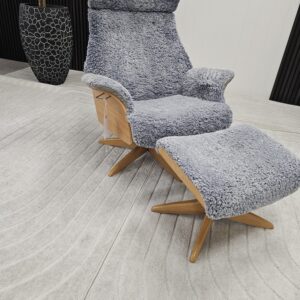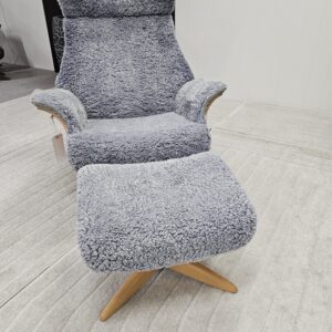 Eksklusivt sett – Conform Air lenestol m/krakk i grått fåreskinn – heltre eik understell.