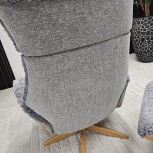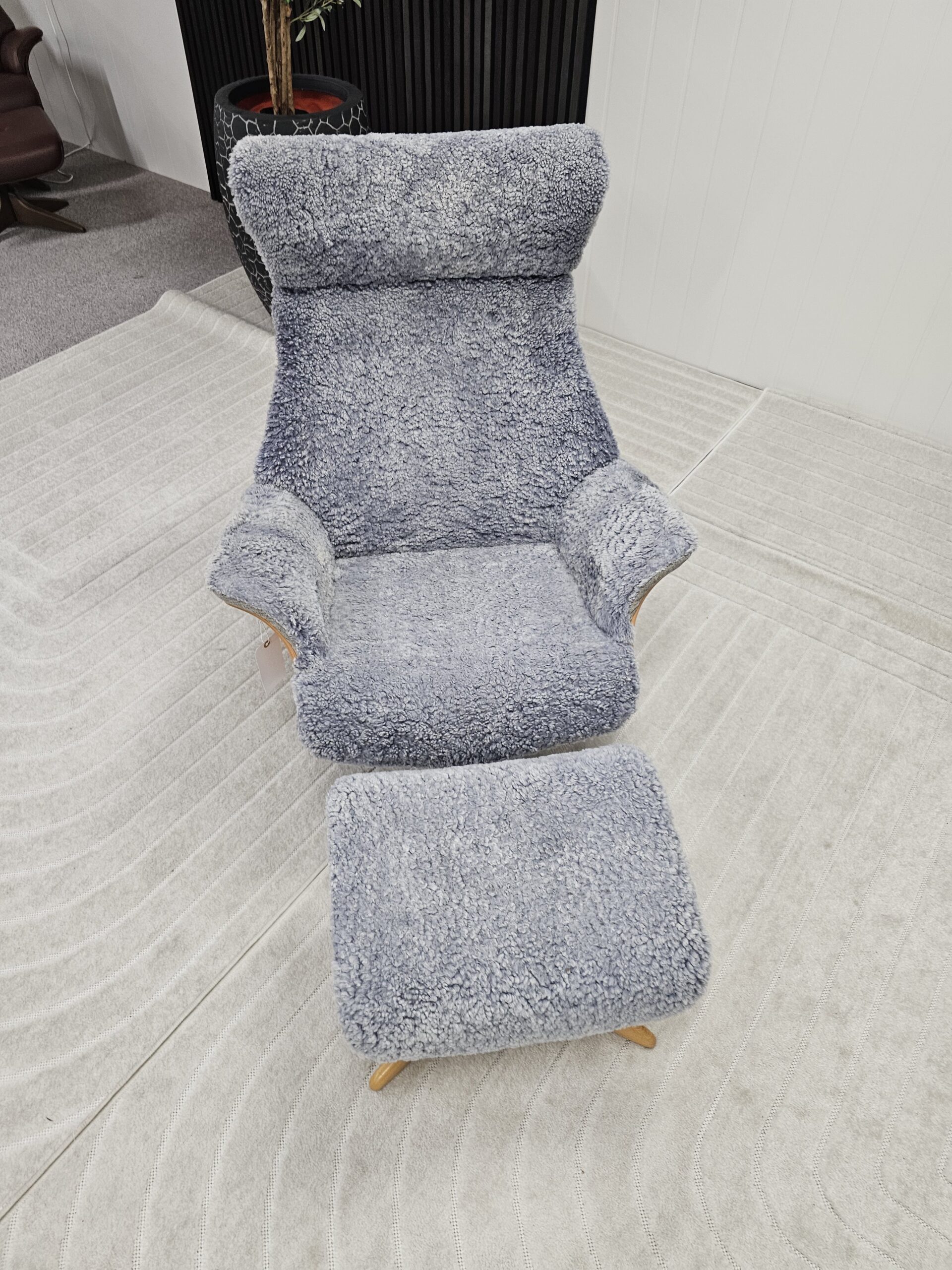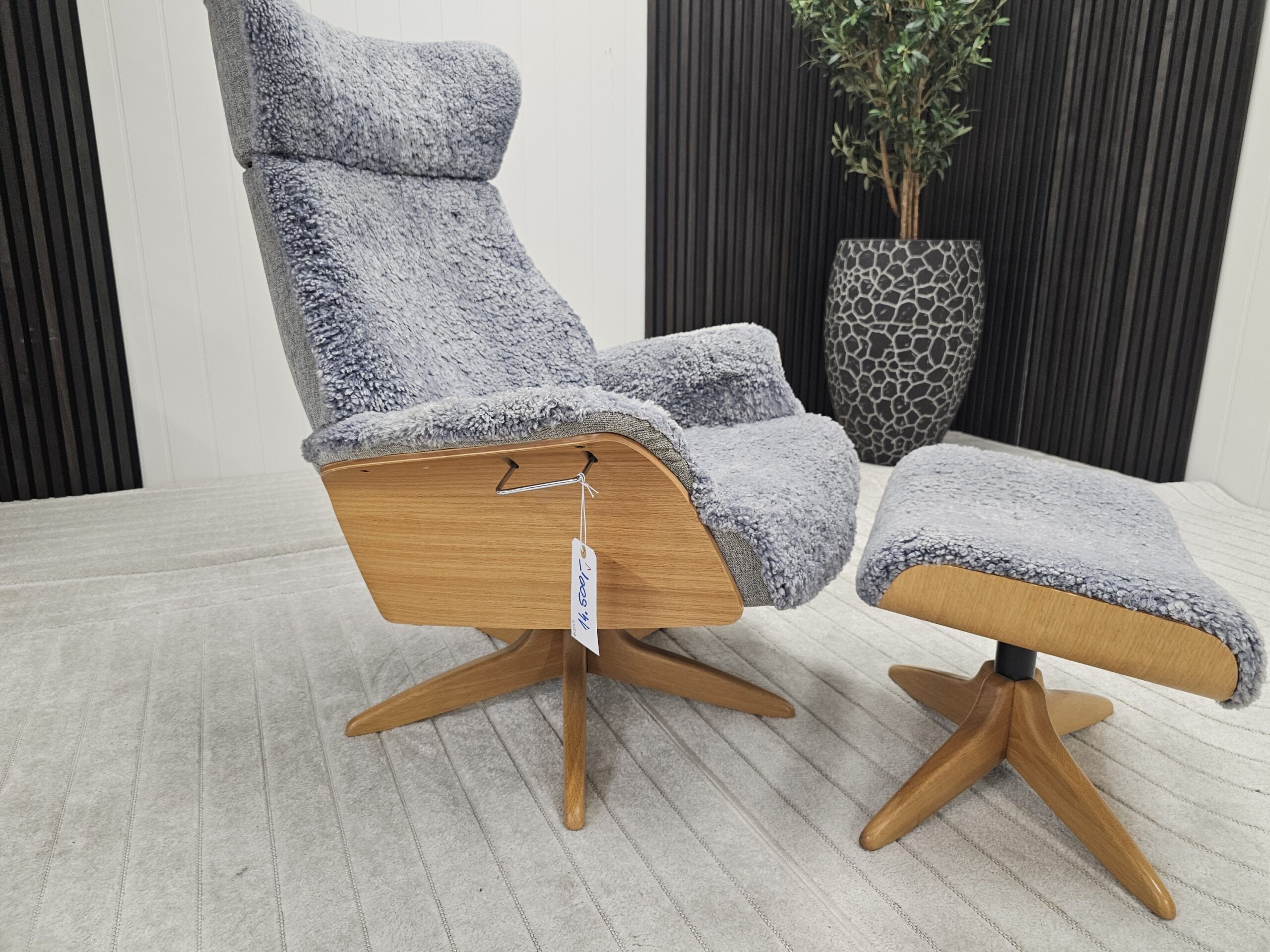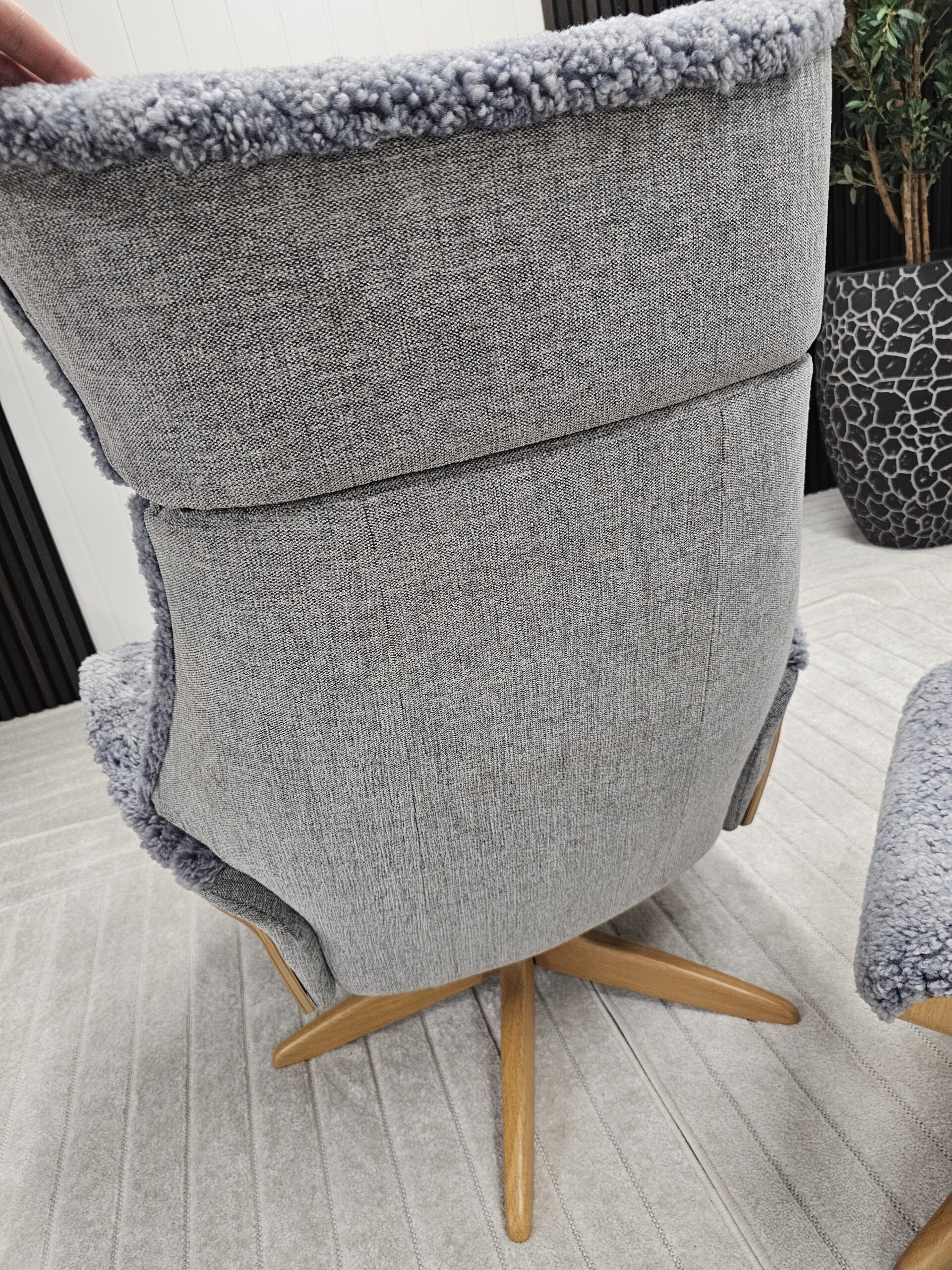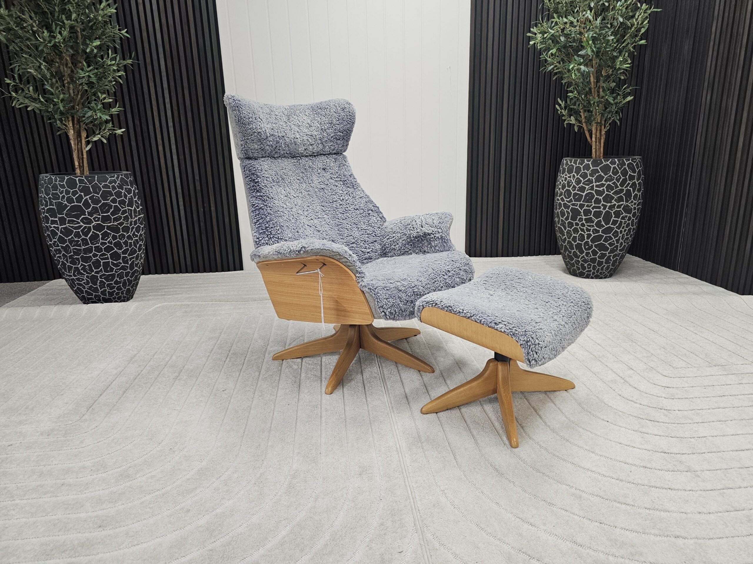 Eksklusivt sett – Conform Air lenestol m/krakk i grått fåreskinn – heltre eik understell.
