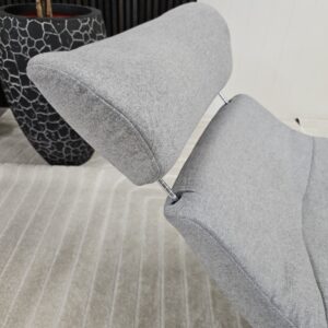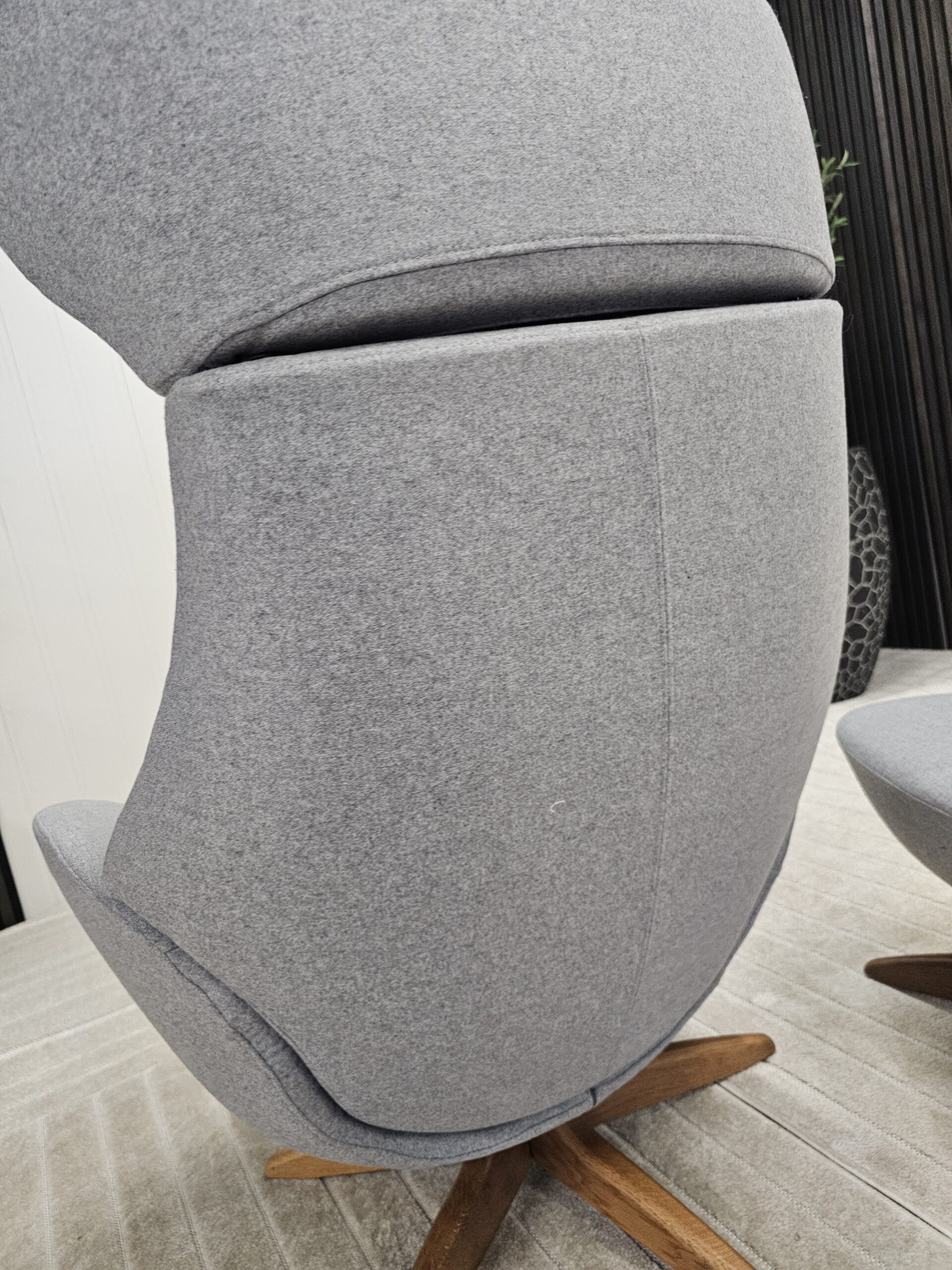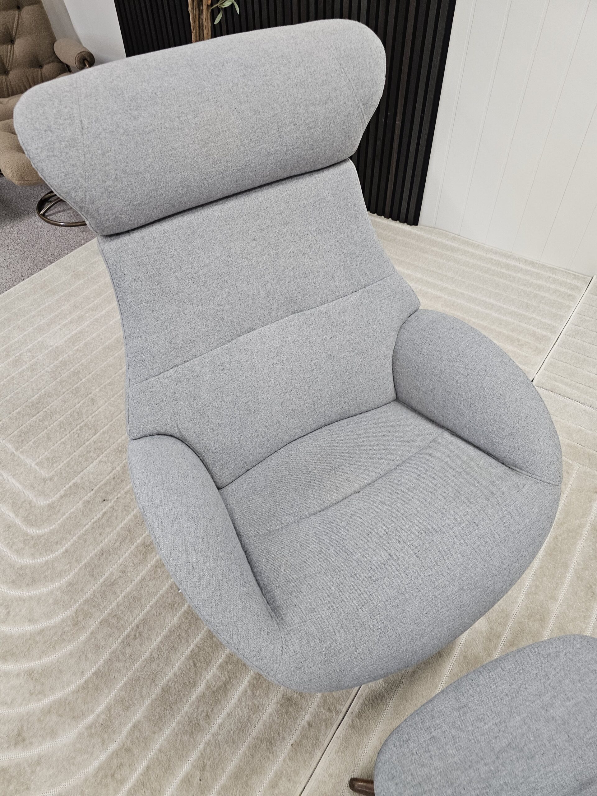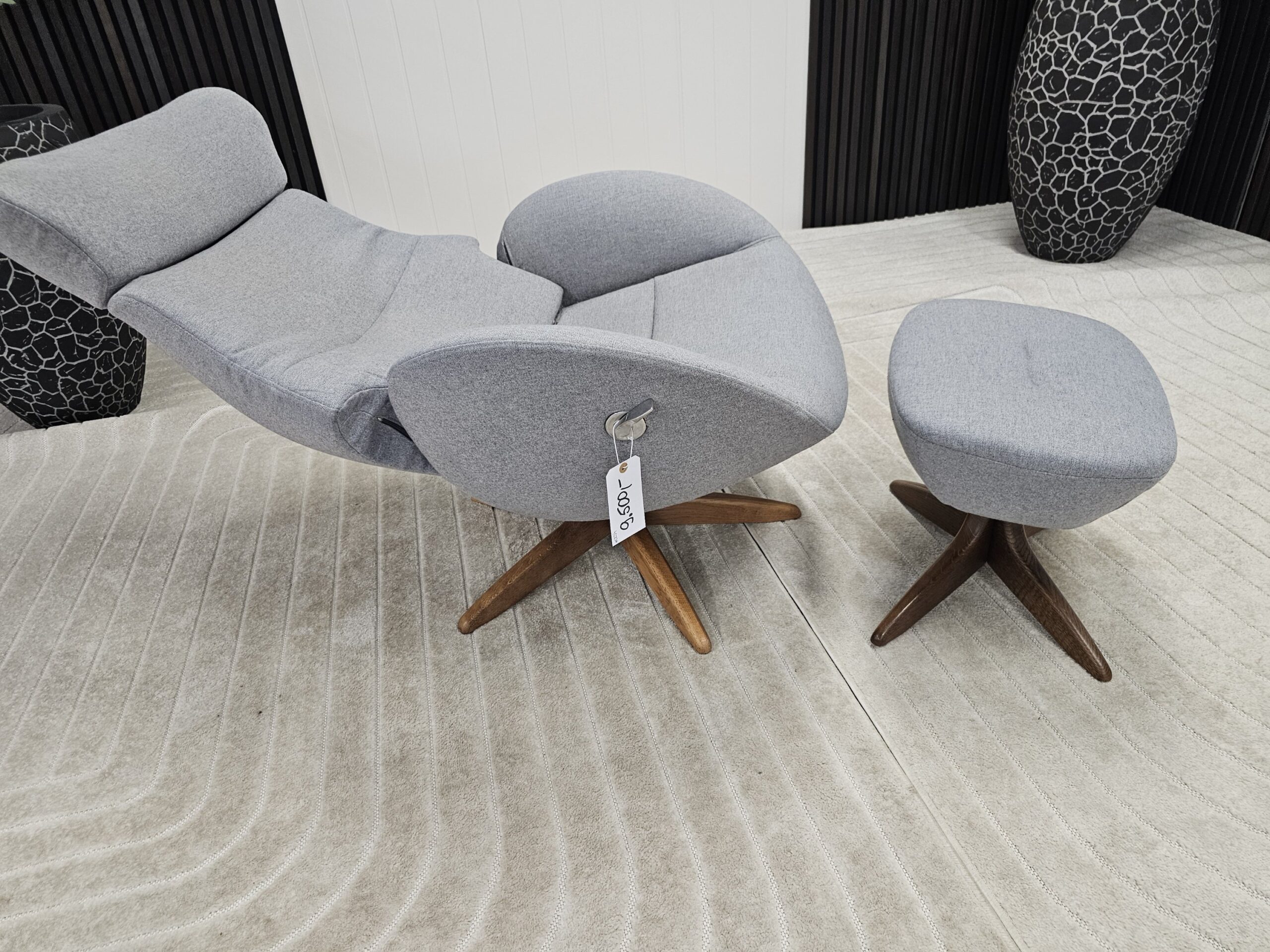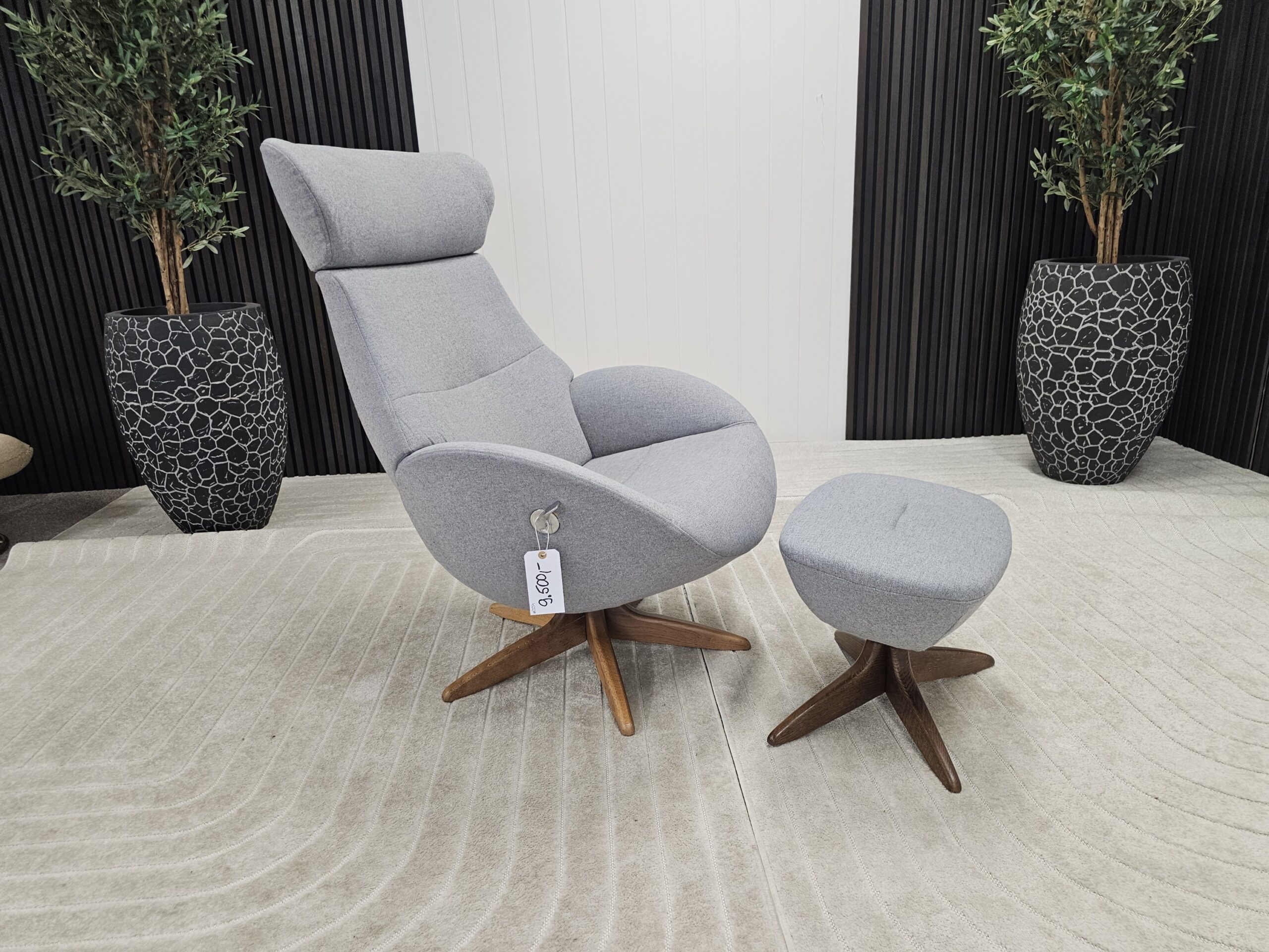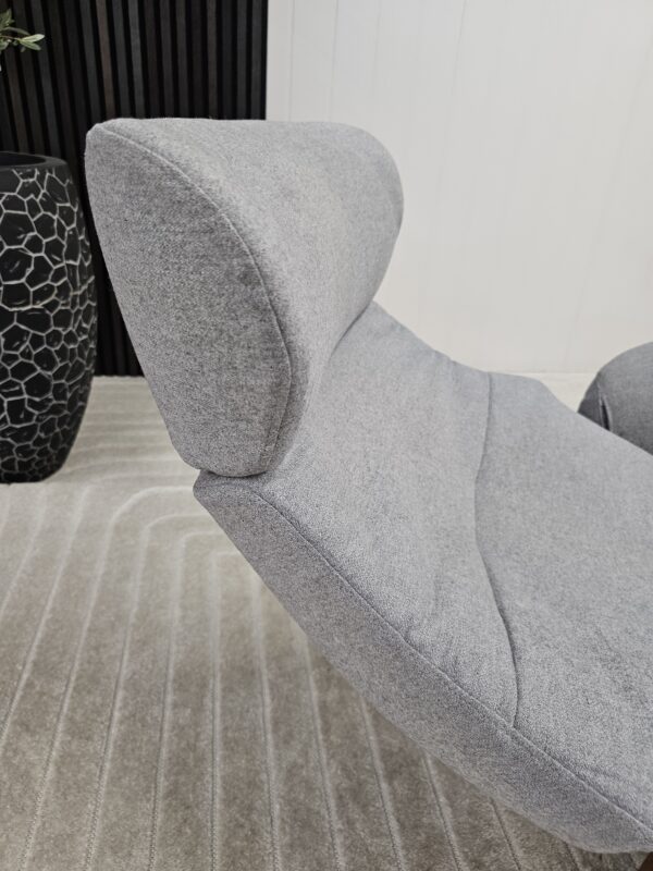 Conform Globe lenestol med krakk – Tekstil Evita grå. Valnøtt understell.