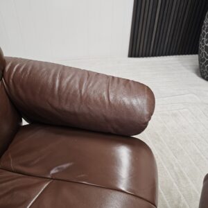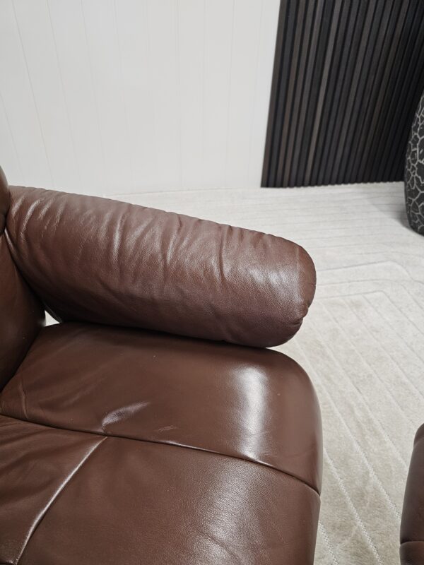 Trukket i eksklusivt Paloma Chocolate skinn med solid Classic understell i brunbeiset treverk – en tidløs kombinasjon av komfort og design.